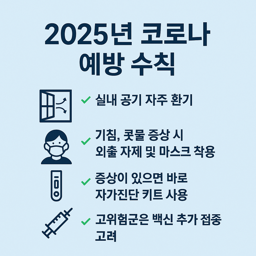 2025년의 코로나는 2020년의 그것과 다릅니다. 그러나 변이의 진화는 계속되고 있고, 우리도 이에 맞춘 대응이 필요합니다. 아래는 재유행 속 나와 가족을 지키기 위한 실질적 예방 수칙입니다: