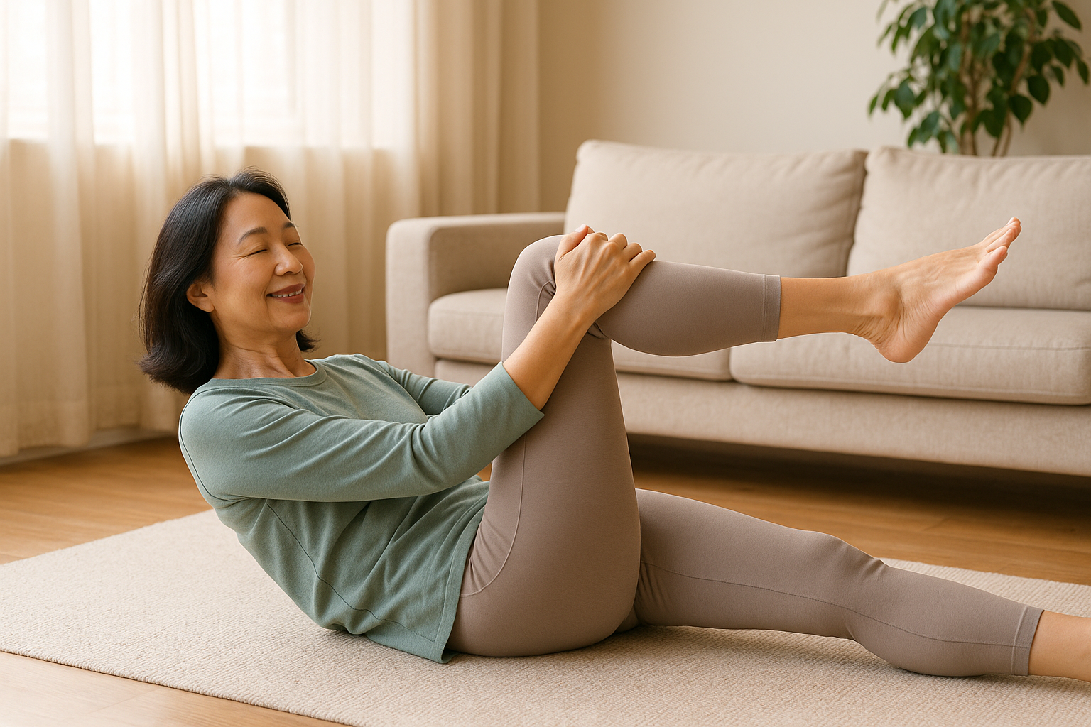 - 바닥에 누워 무릎 굽히고 다리를 가슴 쪽으로 천천히 당깁니다.